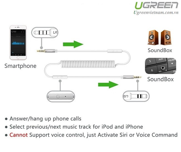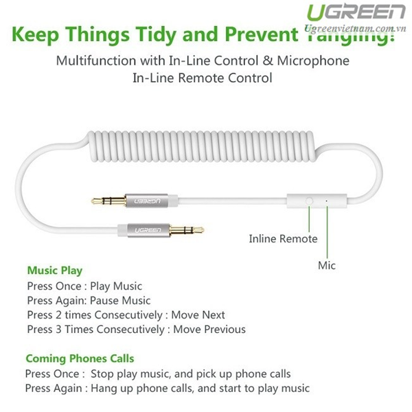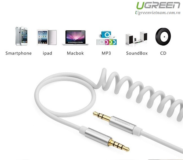 - Cáp AUX lò xo Ugreen 20706 màu trắng với 2 đầu 3,5mm có hỗ trợ Mic, dây đa chức năng cáp âm thanh, sử dụng thiết kế lò xo ống lồng, độ trung thực cao âm thanh chất lượng.