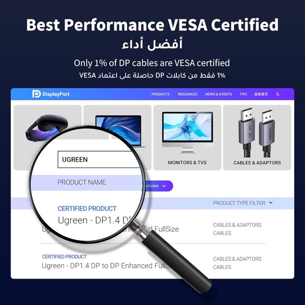 Cáp DisplayPort này được chứng nhận VESA và là cáp video chuẩn DP 1.4. So với DP1.2 21.6Gbit/giây, DP1.4 có tốc độ truyền tải lên đến 32.4Gbit/giây, cho phép truyền tải âm thanh và video đồng thời và nhanh chóng, mang đến trải nghiệm nghe nhạc phong phú hơn và trải nghiệm chơi game sống động hơn. Cáp 8K này được làm từ chất liệu bện nylon, có khả năng chống nhiễu mạnh mẽ. Bên trong được phủ thiếc, đảm bảo hình ảnh phát sóng trực tiếp ổn định, không bị trễ hay giật.
