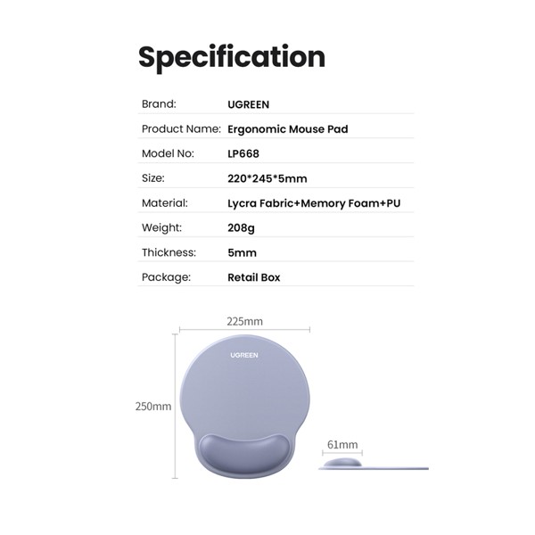 Thông số kỹ thuật: Tấm lót chuột cao su massage cổ tay Ugreen 25244/LP668 cao cấp (Màu Xám)