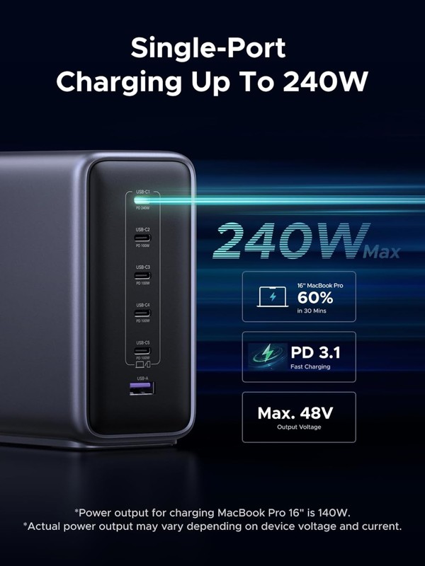 Tổng công suất đầu ra của các cổng lên đến 500W, với một cổng hỗ trợ sạc nhanh PD lên đến 240W. Hoàn hảo để cấp nguồn cho các thiết bị hiệu năng cao như máy tính xách tay chơi game, cũng như các thiết bị điện tử hàng ngày của bạn.