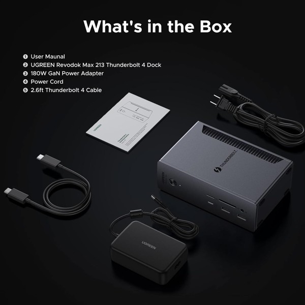 Docking Ugreen 25054EU 13 in 1 được trang bị 2 cổng Thunderbolt 4 (40Gbps, 15W), 1 DisplayPort 1.4, 1 cổng Ethernet 2.5Gb, đầu đọc thẻ SD/TF 4.0, 1 cổng USB-C 3.2 (10Gbps, 20W), 2 cổng USB-A 3.2 (10Gbps), 2 cổng USB-A 3.0, cổng âm thanh 3.5mm và nguồn DC 180W, mang đến sự linh hoạt vượt trội cho máy trạm của bạn.