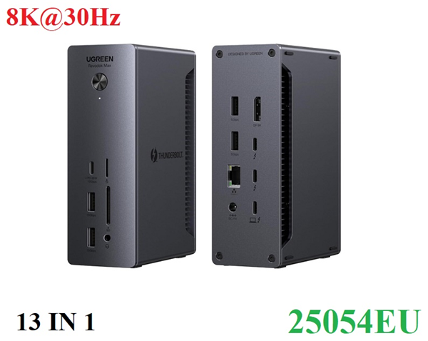 Thông số kỹ thuật: Docking Revodok Max 213, 13 trong 1, tốc độ 40Gbps, hỗ trợ 8K@30Hz, có màn hình kép, Lan 2.5GbE, khe cắm SD/TF, PD 90W Ugreen 25054EU cao cấp