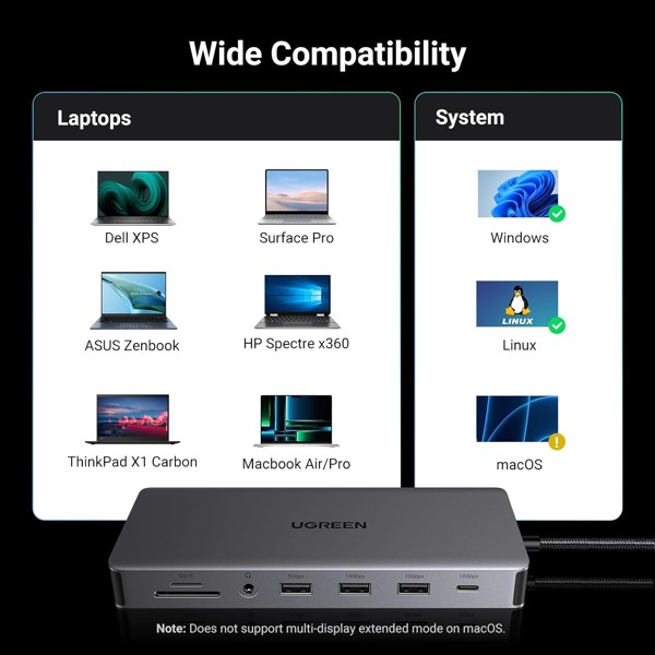 Hỗ trợ hiển thị ba màn hình lên đến 4K. Hỗ trợ hiển thị một và hai màn hình lên đến 4K@60Hz. Xin lưu ý rằng do những hạn chế của MacOS, tất cả các màn hình mở rộng sẽ hiển thị cùng một nội dung khi kết nối với MacBook.