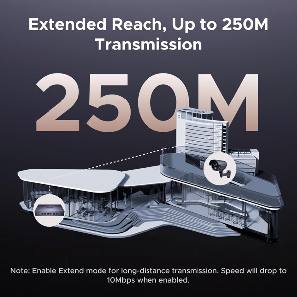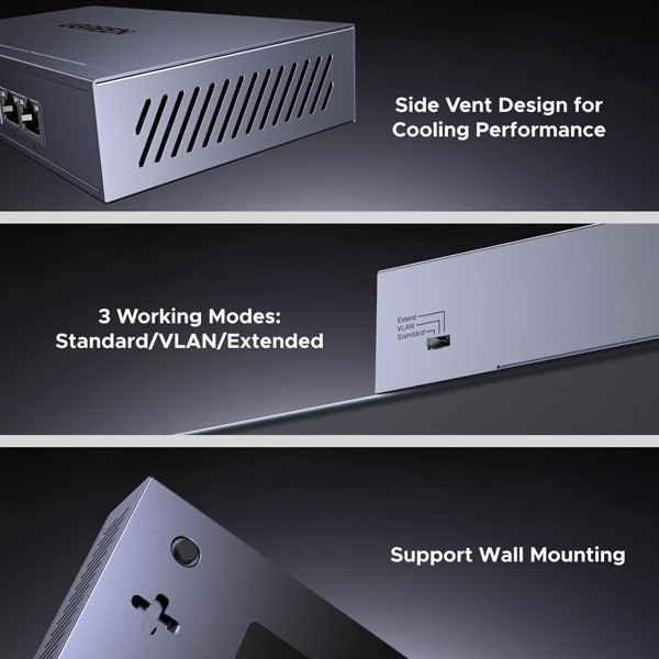 Bộ chia Ethernet dễ dàng chuyển đổi giữa các chế độ Chuẩn, VLAN và Mở rộng. Ở chế độ VLAN, các cổng 1-4 được cách ly với nhau nhưng vẫn có thể giao tiếp với các cổng 5-6, giúp cải thiện quản lý mạng và ngăn ngừa hiện tượng nhiễu sóng. Chế độ Mở rộng hỗ trợ PoE với khả năng truyền dữ liệu lên đến 200 mét, lý tưởng cho bảo mật và vùng phủ sóng mạng từ xa.