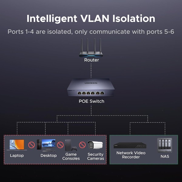 Thông số kỹ thuật: Switch chia mạng 6 cổng LAN Gigabit hỗ trợ POE 60W Ugreen 35371 cao cấp (EU Plug)